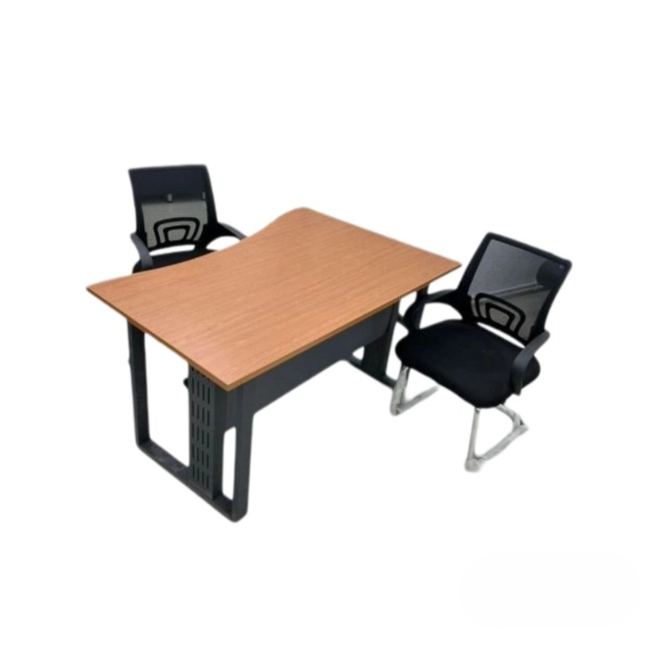 Aménagement de bureau composé d’un bureau en bois rectangulaire et de deux chaises de bureau noires. Le bureau a un dessus en bois marron clair avec des pieds noirs, et les chaises ont des dossiers en maille noire et des sièges rembourrés avec des pieds en métal. Cet aménagement est probablement utilisé pour des réunions ou du travail dans un environnement professionnel. Il n’y a pas de problèmes de mathématiques ni de devoirs dans l’image.
