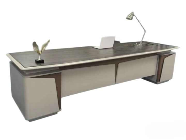 bureau moderne et élégant. Le bureau est de couleur grise avec un plateau en bois foncé. Sur le bureau, il y a un ordinateur portable blanc, une lampe de bureau argentée et un objet décoratif en forme de plume dorée. Le design du bureau est minimaliste et sophistiqué, avec des lignes épurées et des matériaux de haute qualité.