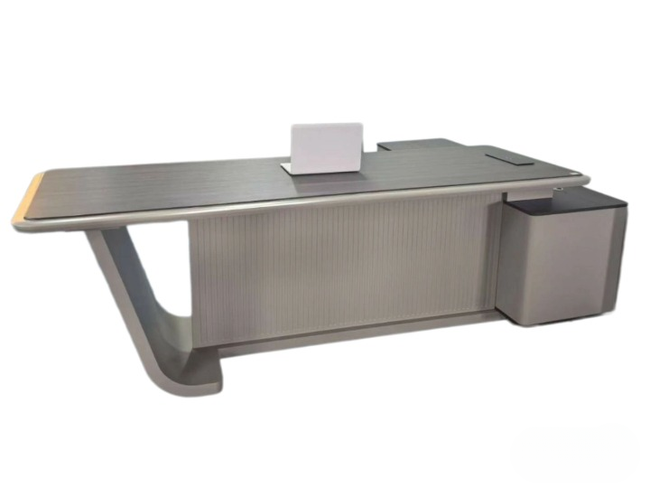 bureau moderne avec un design élégant et minimaliste. Le bureau est principalement de couleur grise avec une surface lisse et des lignes épurées. Il a une structure unique avec un support en forme de « L » sur le côté gauche et un compartiment de rangement rectangulaire sur le côté droit. Un objet rectangulaire blanc, probablement un ordinateur portable ou un document, est placé au centre du bureau. Ce bureau pourrait être intéressant pour ceux qui recherchent un mobilier de bureau contemporain et fonctionnel.