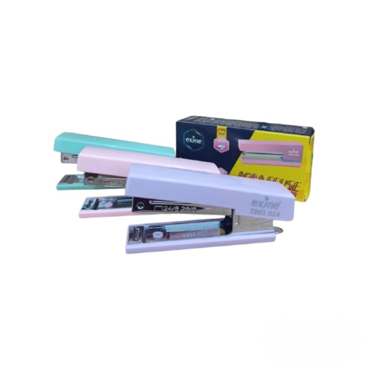 agrafeuses de la marque « exine » alignées horizontalement. Les agrafeuses sont de couleur pastel : une est bleu clair, une autre est rose pâle, et la troisième est violette. À l’arrière-plan, il y a une boîte d’emballage de la même marque, avec des illustrations et des informations sur le produit. La boîte est principalement noire et jaune avec des accents roses et bleus. Le logo « exine » est visible sur les agrafeuses et sur la boîte. Le modèle des agrafeuses est « IB01 014 » et elles utilisent des agrafes de type « 24/6 ».