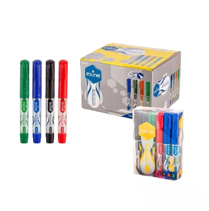 ensemble de marqueurs effaçables à sec de la marque « exine ». L’image montre trois éléments principaux : un paquet de quatre marqueurs de différentes couleurs (vert, bleu, noir et rouge), une boîte contenant plusieurs paquets de ces marqueurs, et un paquet individuel de quatre marqueurs. Les marqueurs sont étiquetés avec la marque « exine » et sont destinés à être utilisés sur des tableaux blancs. La boîte indique qu’elle contient 12 marqueurs.