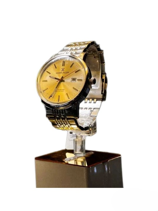 La montre a un cadran de couleur or avec des index et des aiguilles noirs. Le nom de la marque « Daniel Klein » est visible sur le cadran. La montre présente également un guichet de date à la position 3 heures. Le bracelet est métallique avec une combinaison de tons or et argent. La montre est montée sur un support transparent, lequel est posé sur une base rectangulaire.